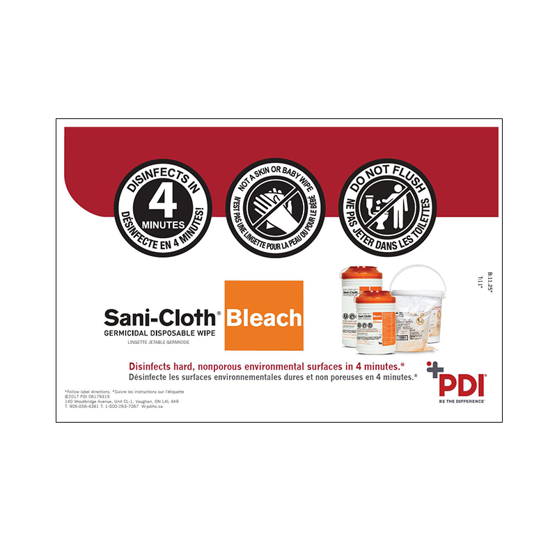 This precautionary sign for Sani-Cloth Bleach wipes has easy-to-identify contact time, not a skin or baby wipe, and does not flush icons in both English and French.